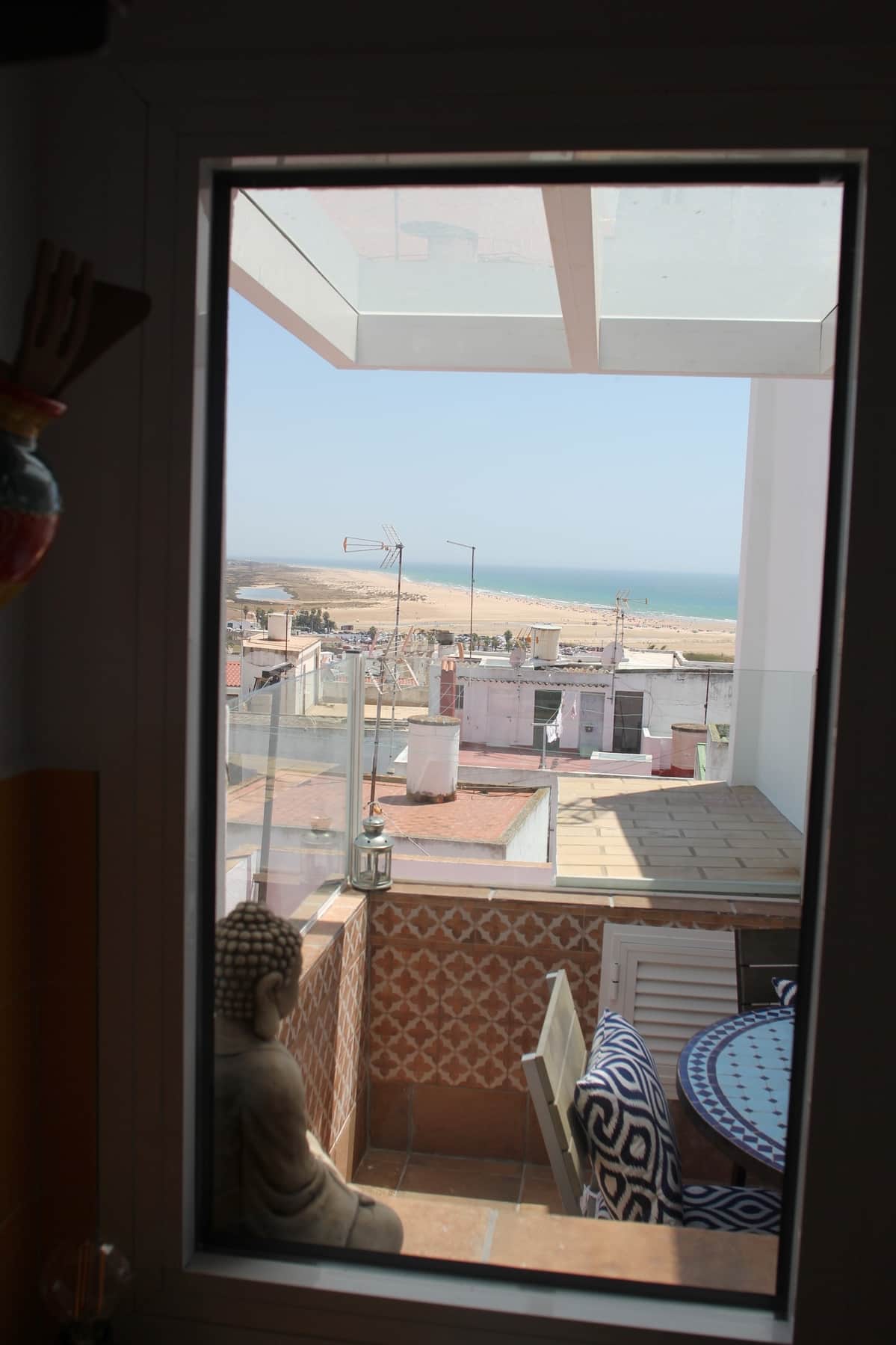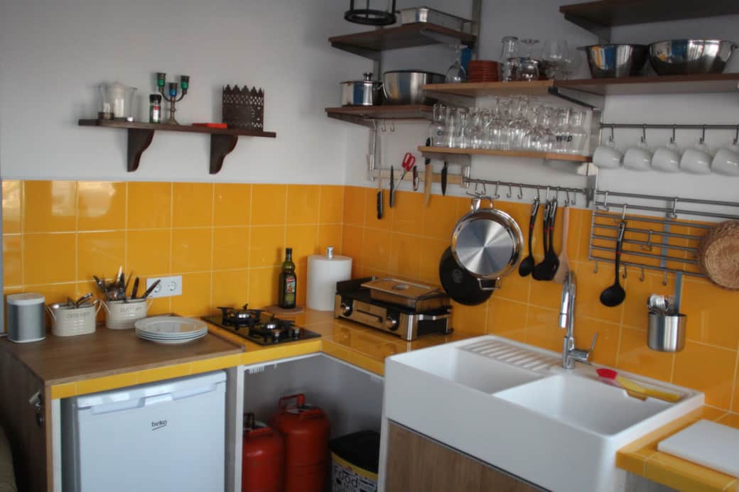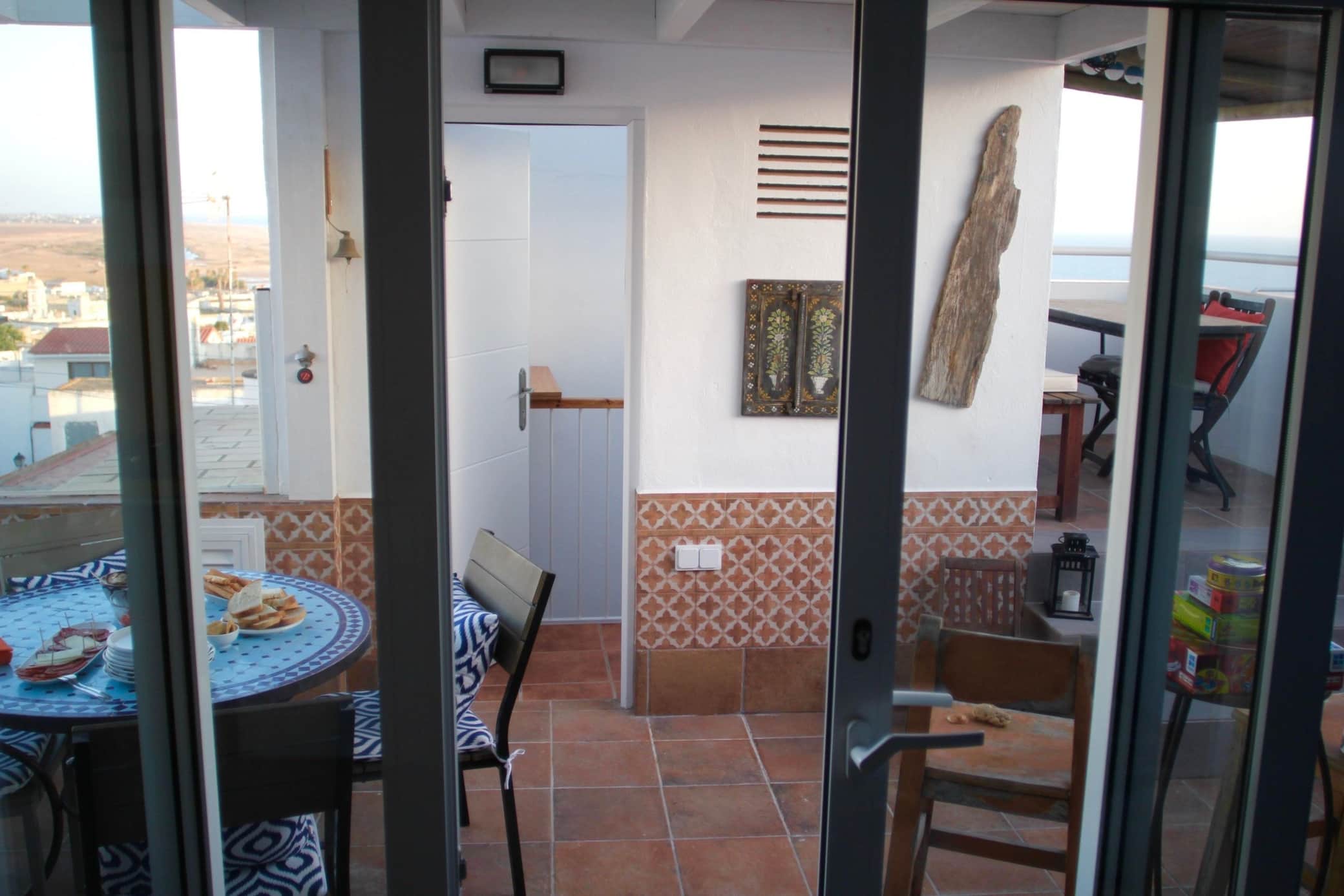 Unsere Sundeck-Kitchen (Küche 2, Foto oben) oben auf der Terrasse verfügt über Kühlschrank, große Villeroy & Boch-Keramik-Spüle, 2-Flammen-Gasherd, Panini-Toaster, Kaffeemaschine, Plancha und Weber-Grill (für draußen). Dazu natürlich Küchen-Utensilien und Geschirr. Kochen mit wunderbarem Blick aufs Meer und ins Campo bis zum Trafalgar-Leuchtturm und Marokko - mehr geht wirklich nicht!