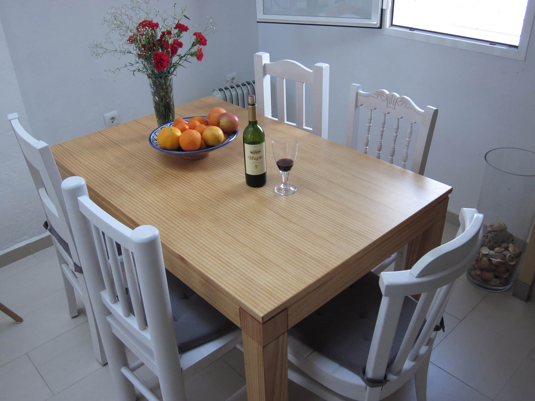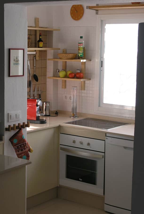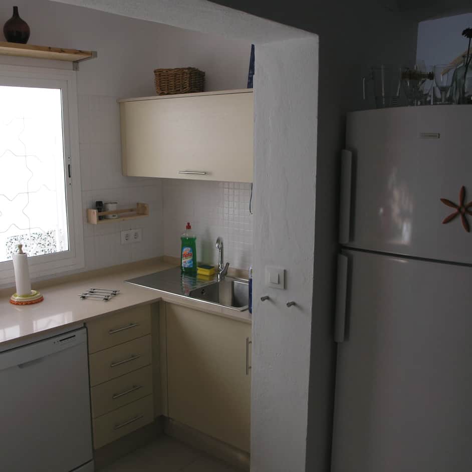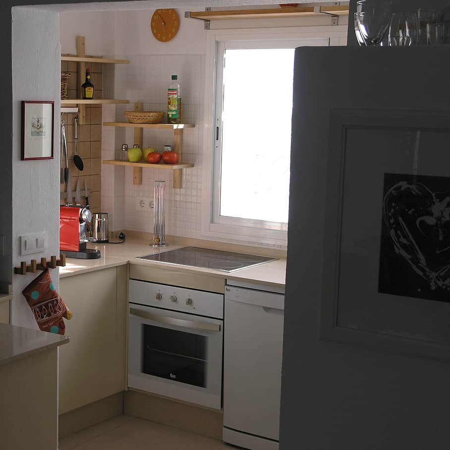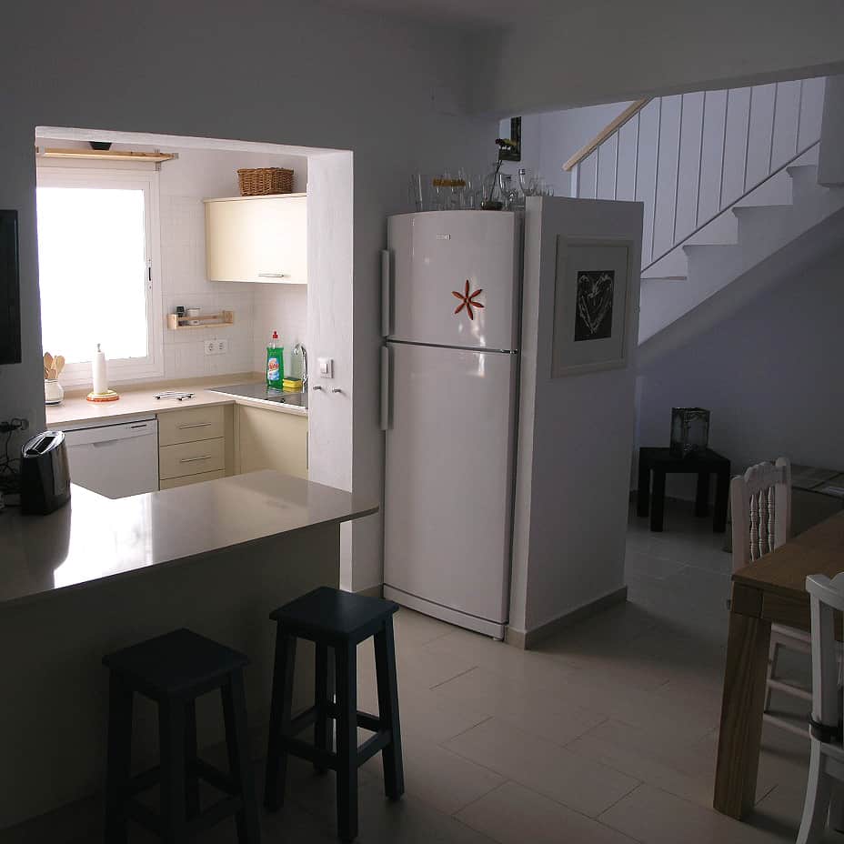 Kochen, Essen, Klönen, Wein genießen - das sind für uns Ferien. Das ist Erholung und Entspannung. Deshalb sind unsere Küchen sehr gut ausgestattet. Im Casa Anik gibt es sogar zwei Cocinas! Gekocht wird unten in einer offenen Küche mit Fenster zum Innenhof. Die Küche verfügt über einen großen Kühlschrank mit Gefrierfächern und einer Menge Platz für frische Waren. Dazu gibt es eine Spülmaschine, einen Herd mit 4-Zonen-Cerankochfeld plus Backofen. Die Kochinsel im offenen Raum - auch als kleine Bar gedacht - bietet Platz und ein Weinregal, und sie verbindet Küche und Wohnraum. In dieser  Haupt-Cocina gibt es neben Töpfen, Pfannen und viel Kochwerkzeug auch Toaster, Sandwichmaker, Mixer, Pürierstab, Wasserkocher, eine elektrische Saftpresse und eine Kaffeemaschine. Dazu viele Gläser, Geschirr und alles was man zum Kochen und Servieren benötigt. Bis hin zum Austernmesser ist alles da.